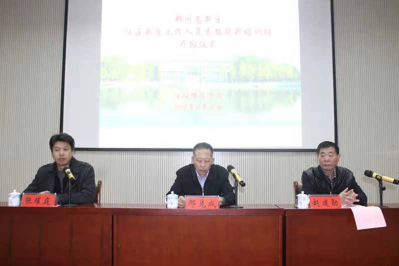 11月12日上午,郑州市高新区社区教育工作人员素能提升培训班开班仪式在pg娱乐电子官网文科楼报告厅举行。pg娱乐电子游戏官网入口副院长邓觅成、郑州高新区管委会社会事业局领导赵建勋、pg娱乐电子游戏官网入口培训科科长张耀庭出席开班仪式,郑州市高新区社区教育全体参训学员参加了开班仪式。开班仪式由张耀庭主持。