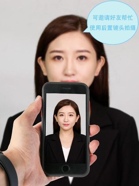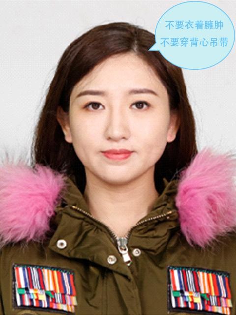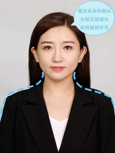 3、露出耳朵和额头,头部正视镜头,保持肩膀齐平,表情自然,嘴唇自然闭合。